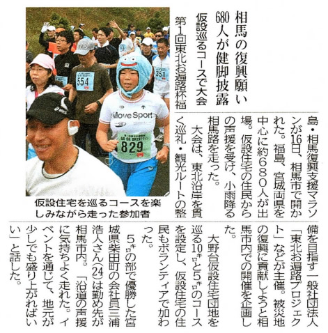 第1回東北お遍路杯福島・相馬復興支援マラソンを2013年6月16日開催しました。「相馬の復興願い680人が健脚披露」として河北新報社に取り上げられました。※ 画像は河北新報掲載記事 関連資料:東北お遍路マラソン大会